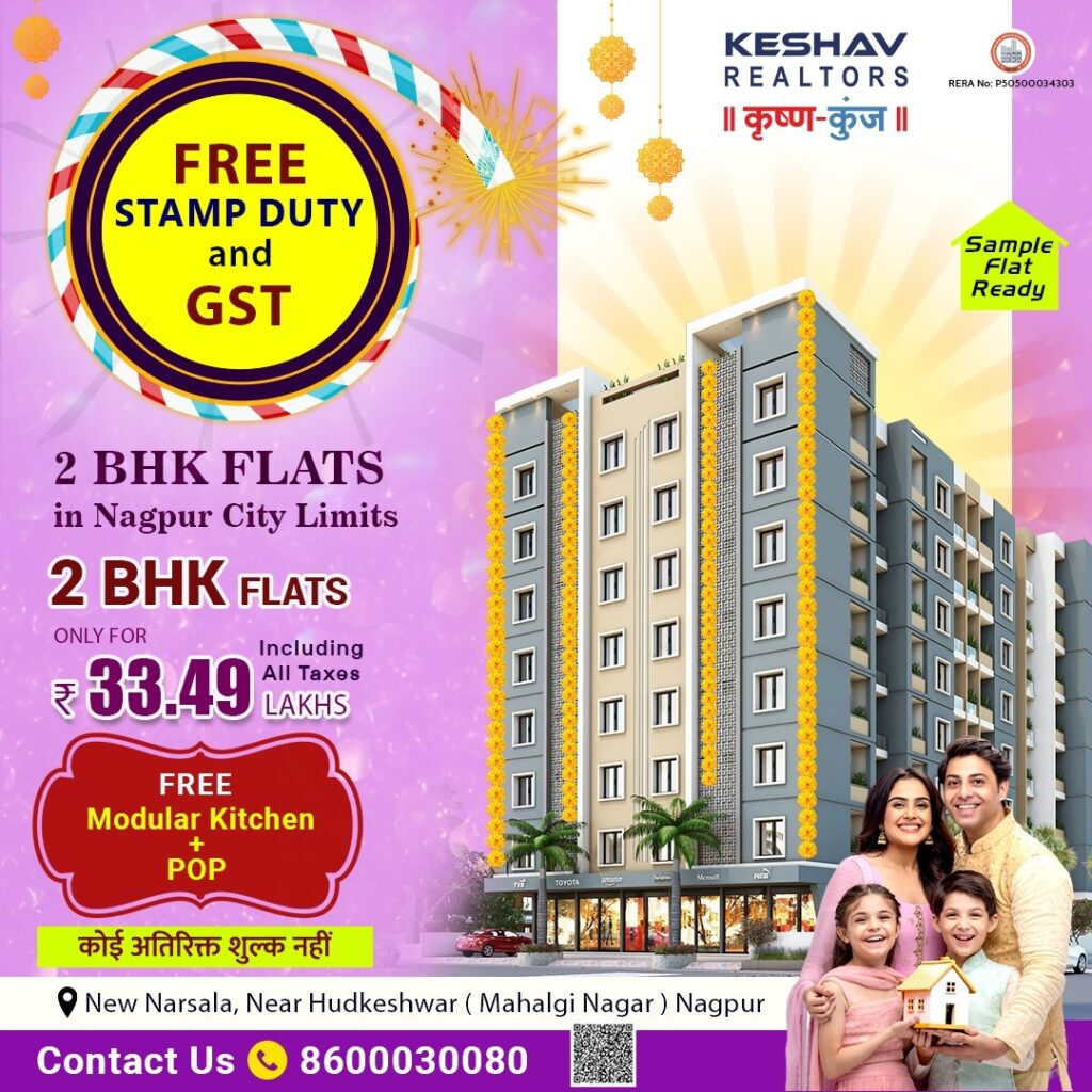 Krushna Kunj is a premium yet budget-friendly residential project by Keshav Realtors, located in Narsala, Nagpur, one of the fastest-developing suburban regions in the city. The project features a 7-floor tower offering 8 spacious 2 BHK flats on each floor (total 56 units), along with a separate block of 1 BHK apartments (5 units per floor)designed for compact living.
